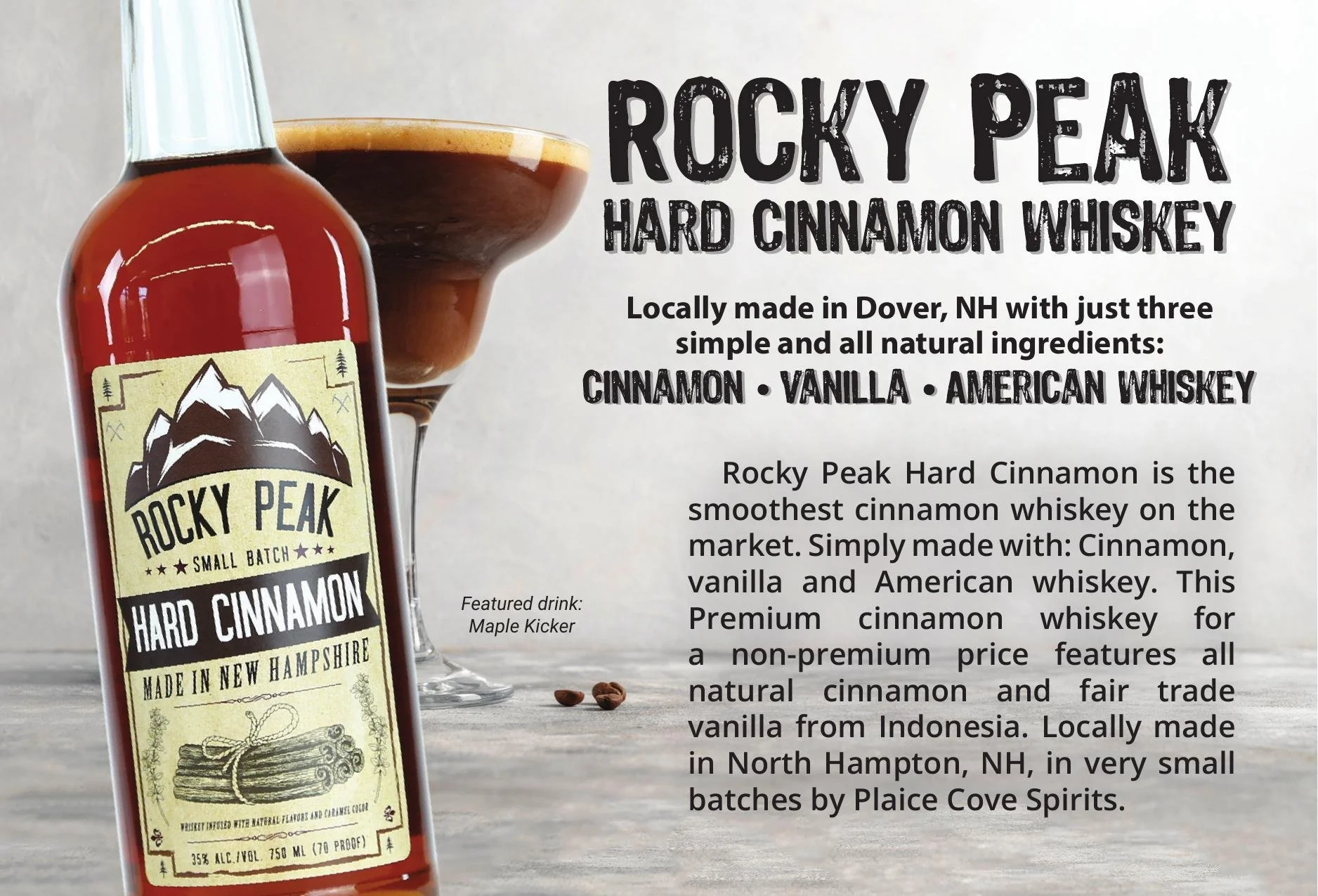 Mixed and bottled in Dover, New Hampshire, Rocky Peak Hard Cinnamon is the smoothest cinnamon whiskey on the market. It’s a premium cinnamon whiskey without the premium price. It’s so good because it’s simple. Cinnamon, vanilla and American whiskey. NH Made, and Gluten Free.